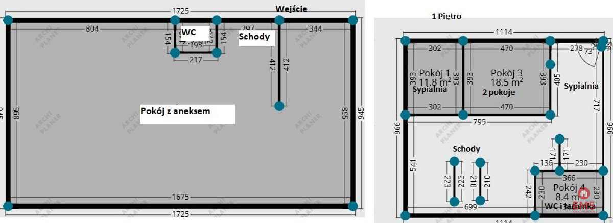 ROZKŁAD POMIESZCZEŃ: Parter:Duży, jasny salon z kominkiem i aneksem kuchennym, WC, wejście do piwnicy z sauną i garażem. Poddasze:2 sypialnie z podwójnymi łóżkami, 2 pokoje rekreacyjne (z możliwością adaptacji na dodatkowe sypialnie), łazienka z wanną i WC.