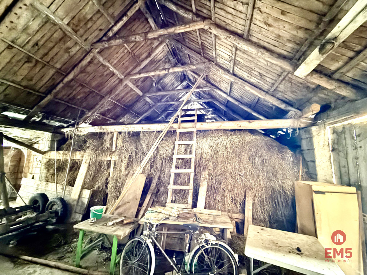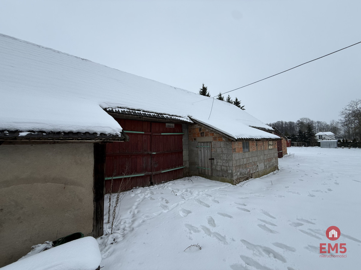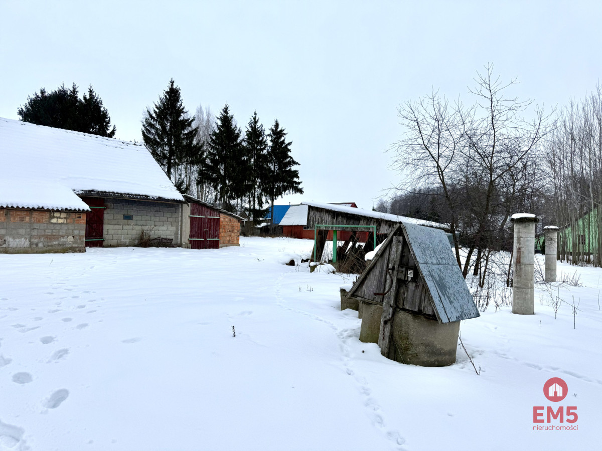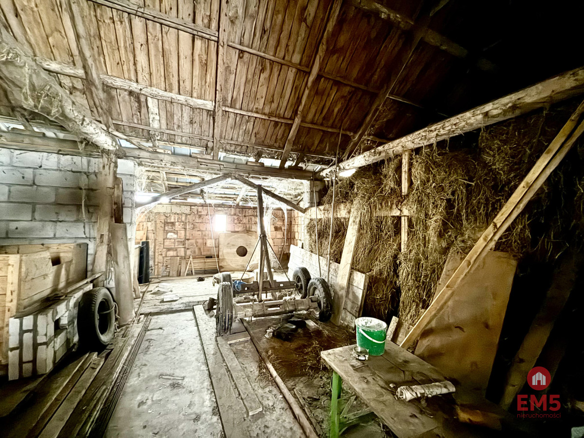 Powierzchnia działki wynosi 9 496 m², a jej wymiary to około 61 metrów szerokości i 155 metrów długości. Na terenie działki znajduje się dom mieszkalny o powierzchni około 100 m², przeznaczony do remontu, w którym znajduje się piec kaflowy, nadający wnętrzu tradycyjny, wiejski charakter. Dodatkowo na siedlisku znajduje się duża stodoła o powierzchni ponad 250 m², tradycyjna wędzarnia oraz studnia, podkreślające autentyczny charakter nieruchomości.