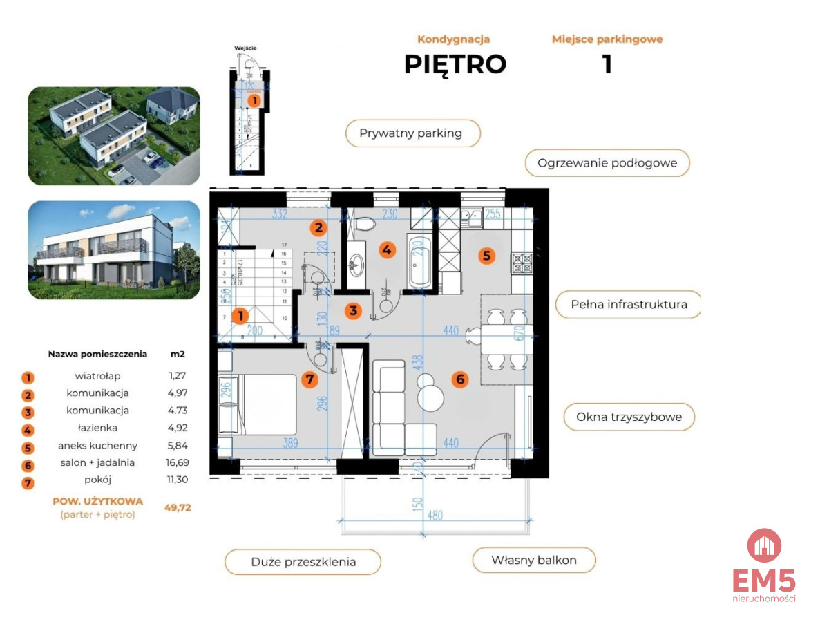 W każdym mieszkaniu zastosowano nowoczesne technologie znane z energooszczędnych domów.Zainstalowano ogrzewanie podłogowe, które zapewnia równomierne ciepło i komfort użytkowania.Dodatkowo każde mieszkanie wyposażone jest w pompę ciepła, dzięki czemu koszty ogrzewania są niższe i bardziej przewidywalne.Wysoką jakość termiczną zapewniają energooszczędne okna trzyszybowe oraz solidna izolacja, które znacząco wpływają na komfort przez cały rok.Cała inwestycja została wykonana z dbałością o szczegóły.