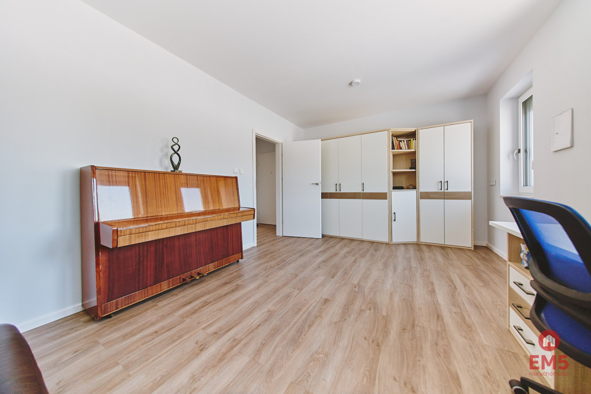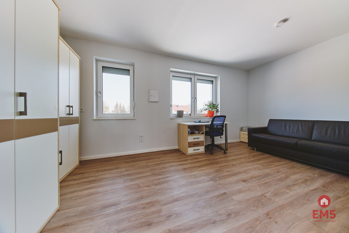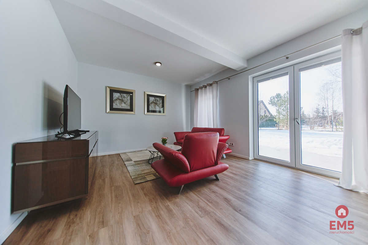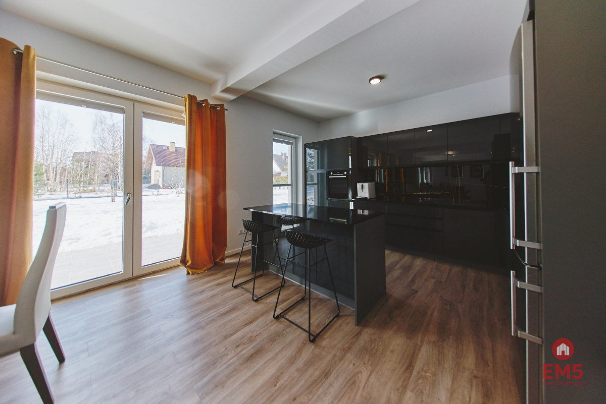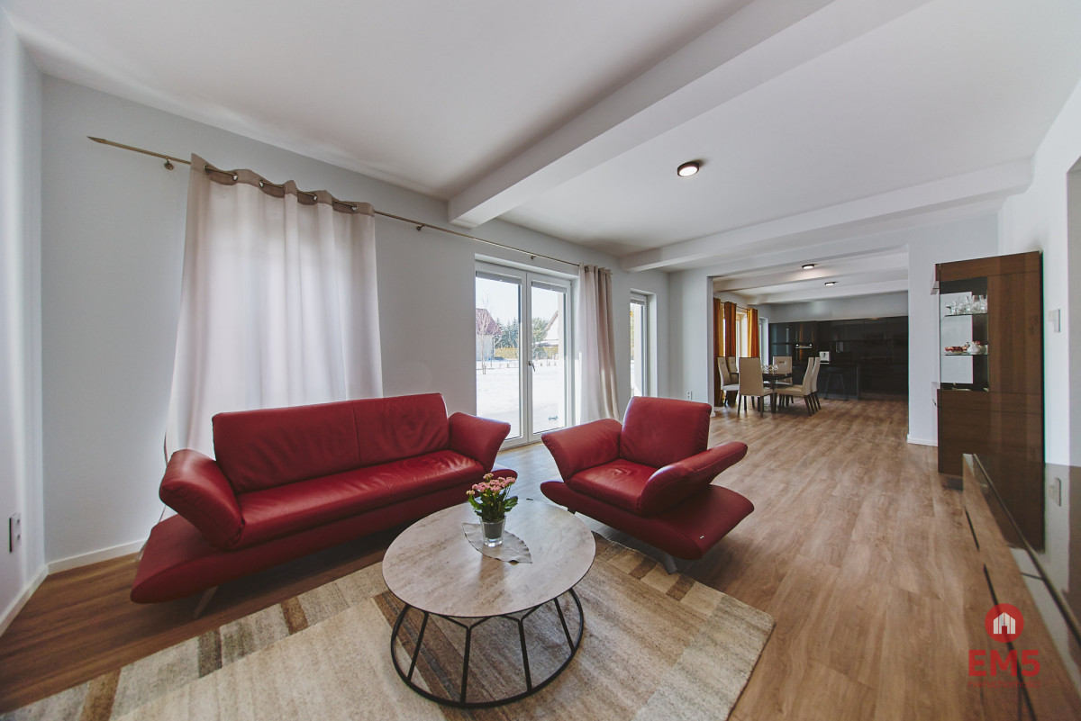 - Przestronna, otwarta strefa dzienna: salon, jadalnia i kuchnia z wyjściem do ogrodu