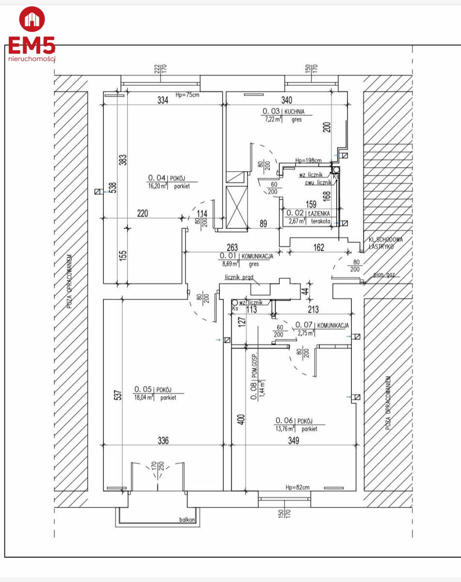 - Powierzchnie: 18 m2, 18 m2, 16 m2, 16 m2