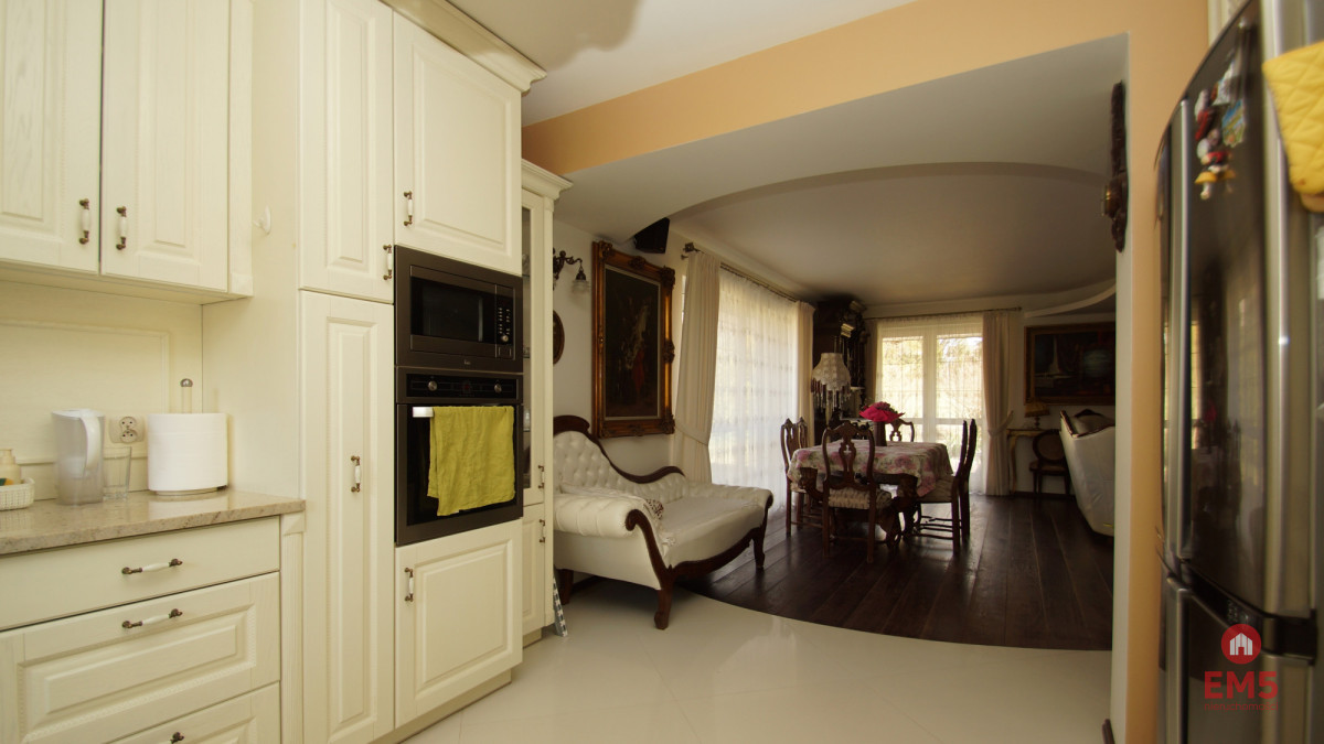 Dom składa się z trzech przestronnych sypialni, dwóch łazienek, a także dużego salonu połączonego z jadalnią i kuchnią. Z salonu prowadzi bezpośrednie wyjście na taras, który stanowi doskonałe miejsce do relaksu i spotkań na świeżym powietrzu. Kuchnia wykonana została z wysokiej jakości drewna dębowego, co nadaje wnętrzu elegancji i trwałości.
