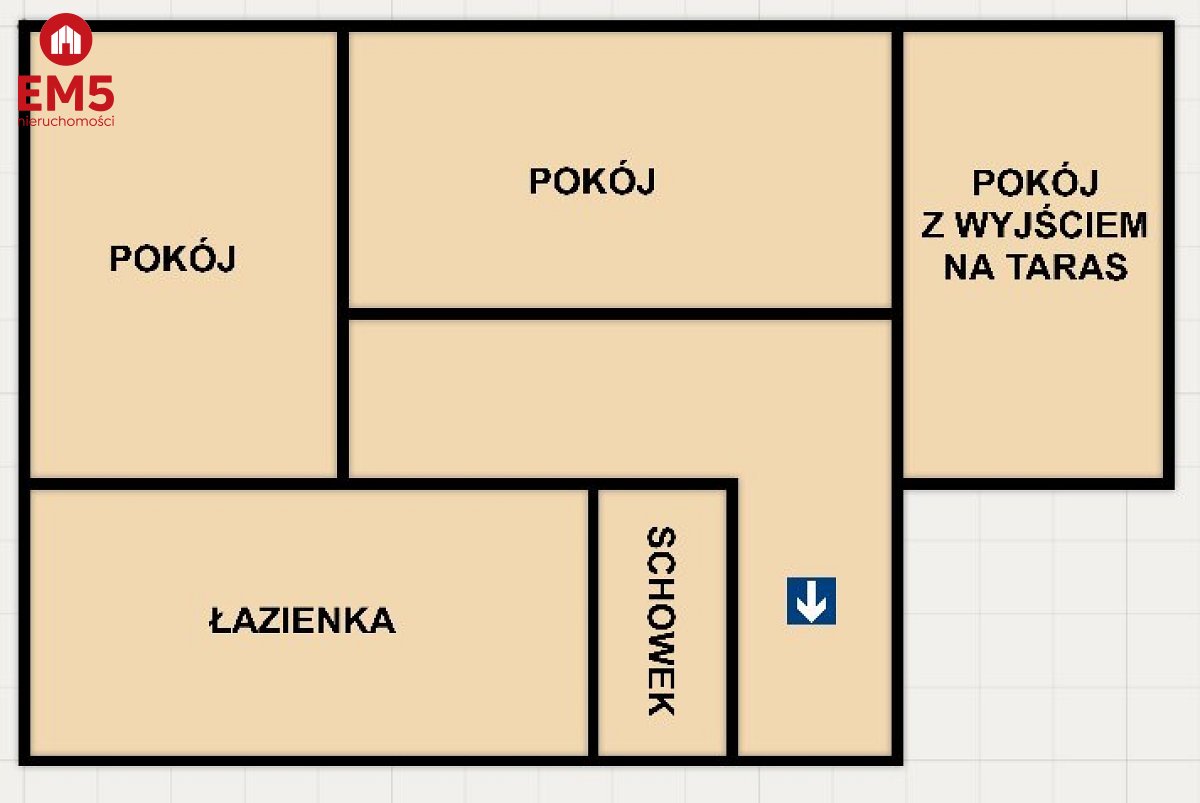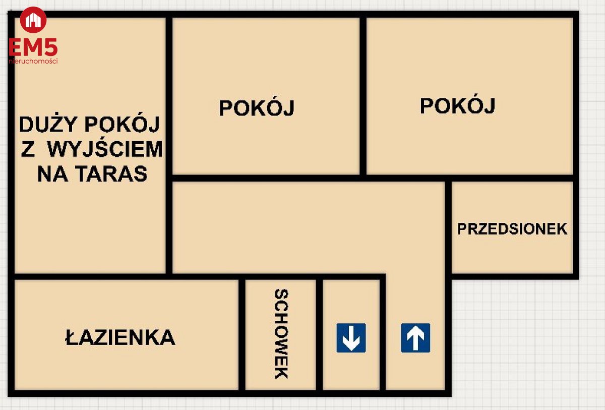 Układ poddasza: 3 sypialnie (jedna z tarasem), łazienka, schowek