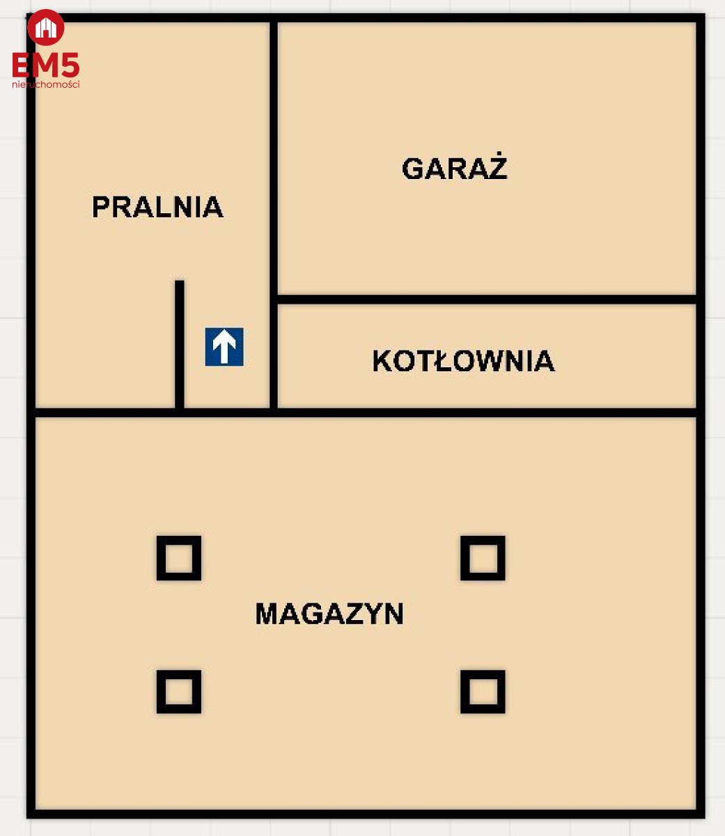 Układ piwnicy: pralnia, garaż, kotłownia, pomieszczenie magazynowe
