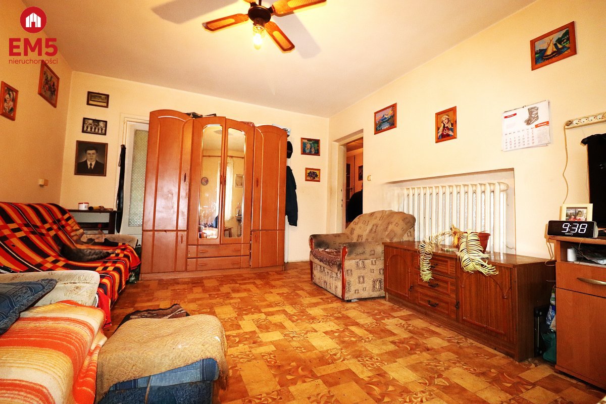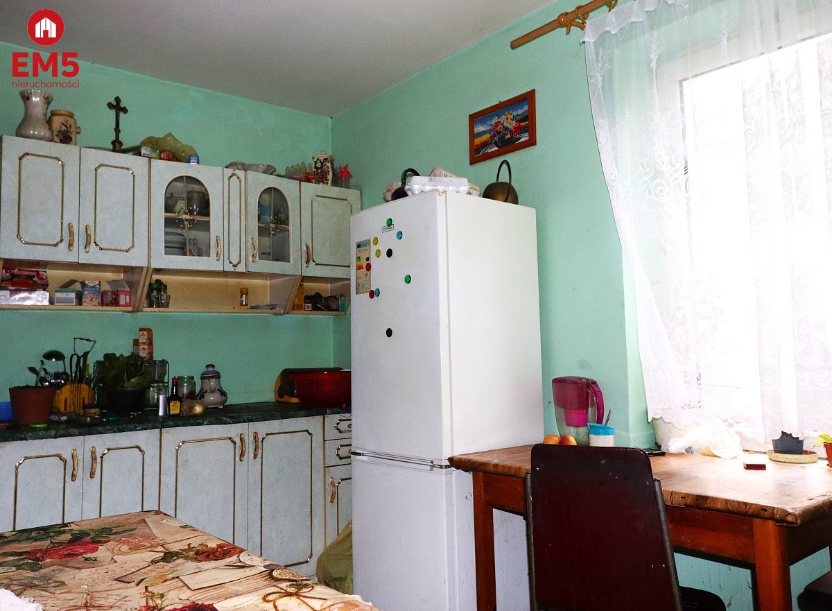 W cenie jest zawarty murowany garaż bez kanału oraz budynek gospodarczy. Jeden pokój widniejący na zdjęciu jest wyremontowany. Wyposażenie do uzgodnienia z właścicielką (część mebli itp. pozostanie zabrana). Dom wymaga remontu, wybudowany w 1965 roku, posiada plastikowe okna, na podłodze terakota oraz gumoleon. Pełna własność.