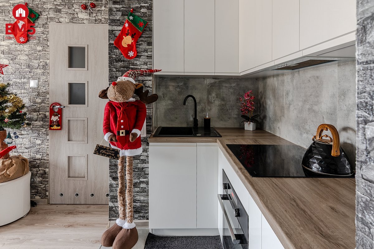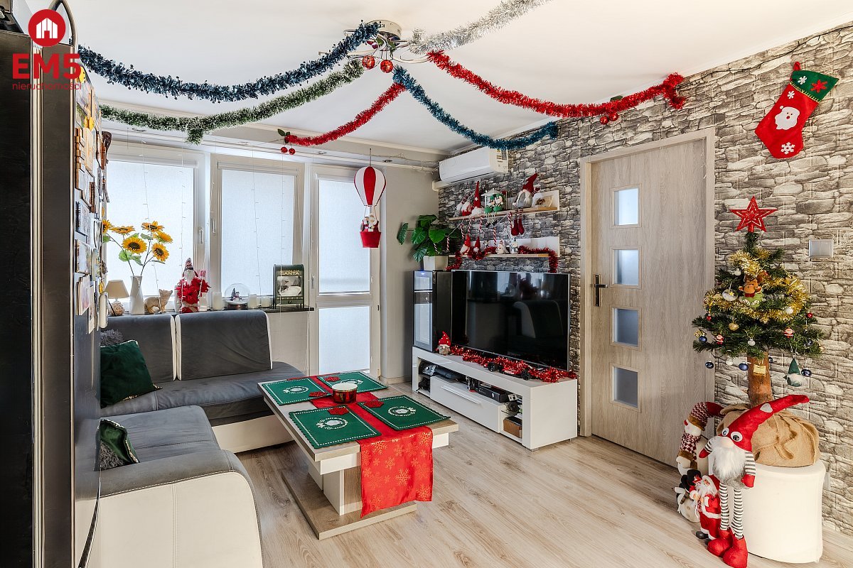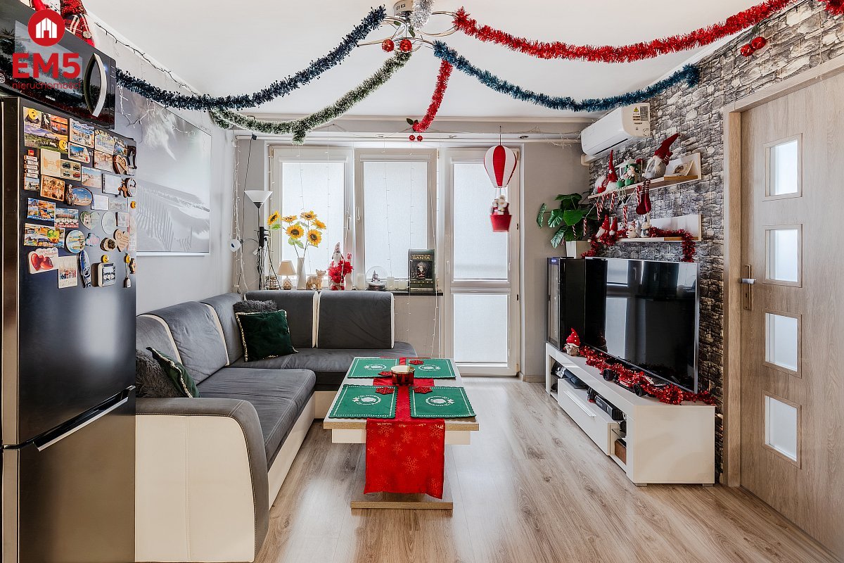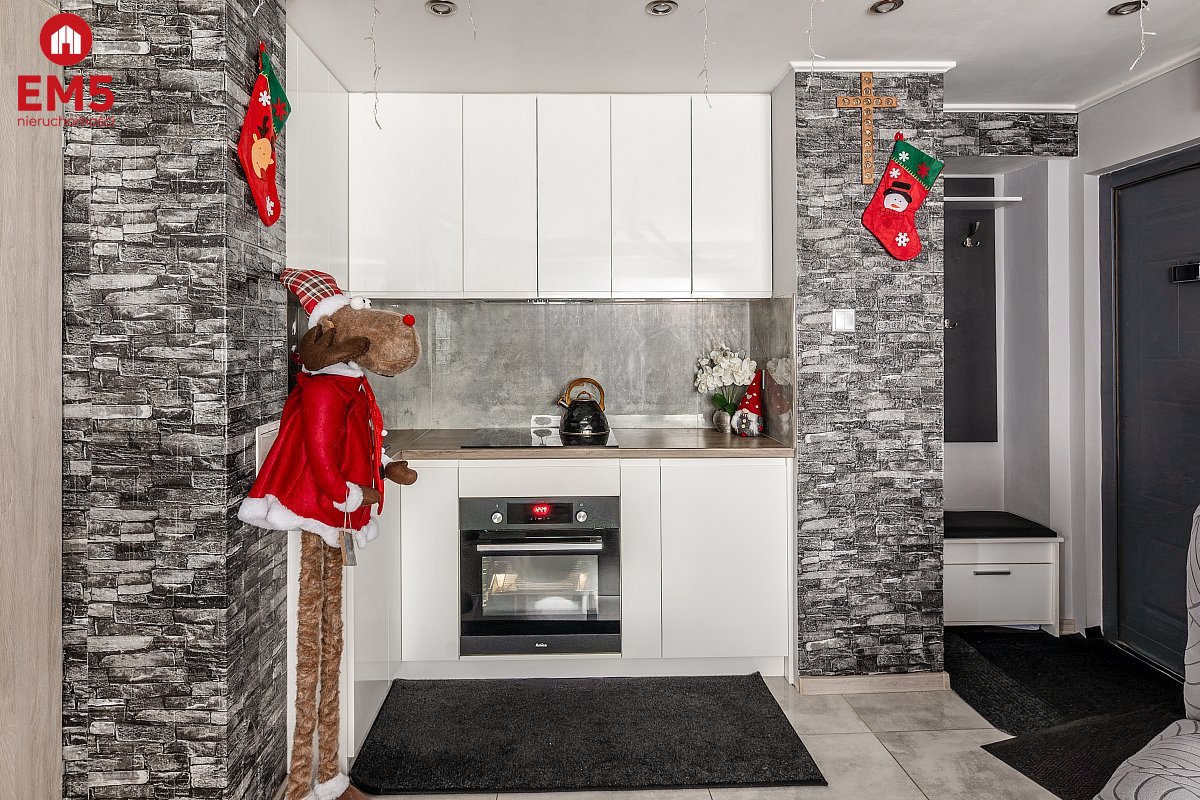 -Salon z aneksem kuchennym i wyjściem na balkon.