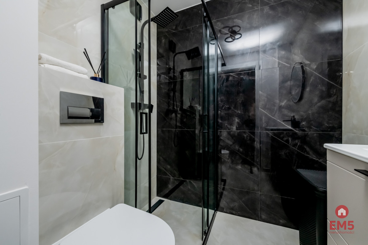 Wnętrza wyróżniają się wysoką jakością wykończenia - dębowa podłoga oraz granitowe parapety nadają elegancji i trwałości. Nowoczesne rozwiązania takie jak dotykowe włączniki światła oraz prysznic z odpływem liniowym zapewniają komfort codziennego użytkowania. Drzwi zlicowane ze ścianą dodają wnętrzom nowoczesnego charakteru.