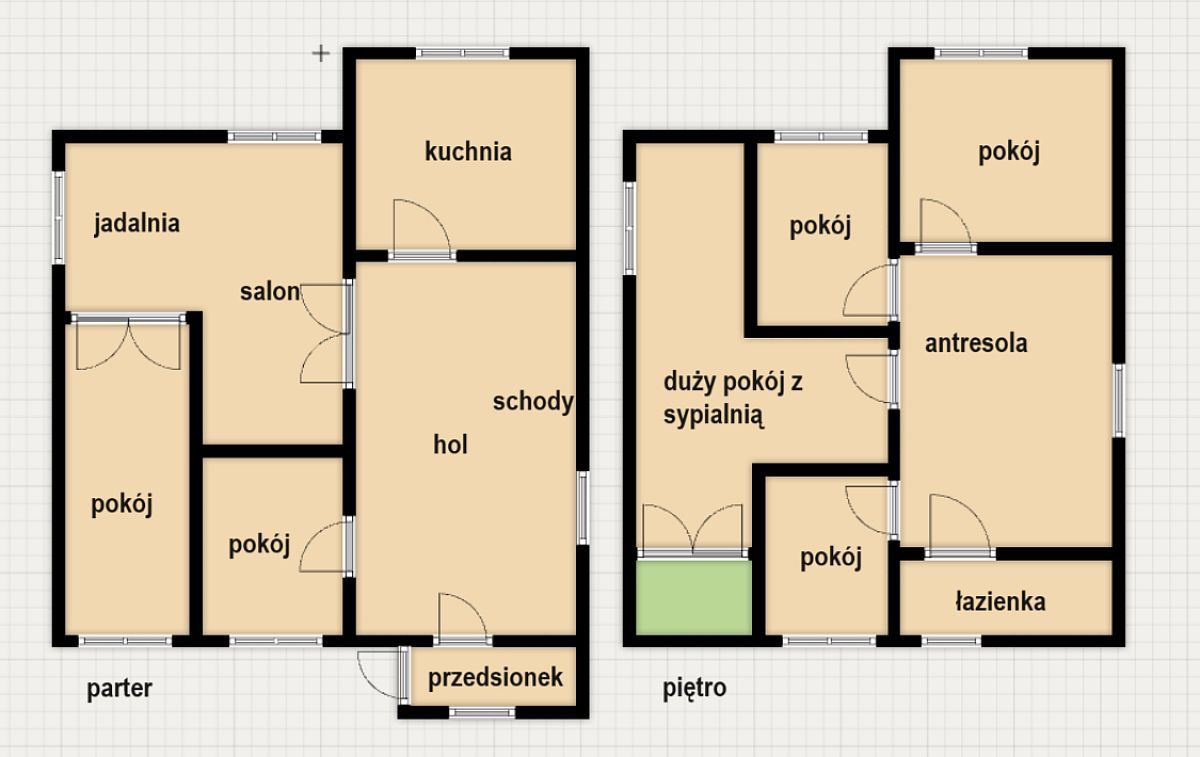 - Parter: Przedsionek, przestronny hol, salon z jadalnią, 2 pokoje, oddzielna kuchnia