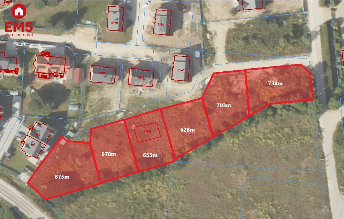 Na sprzedaż w pełni uzbrojone działki budowlane, idealne pod budowę wymarzonego domu! Dostępne powierzchnie: 628m2, 655 m2, 734 m2, 703 m2, 670 m2 oraz 875 m2. Każda działka posiada dostęp do wody miejskiej, kanalizacji miejskiej, prądu oraz internetu światłowodowego. Część działek ma również możliwość podłączenia do gazu. Na działce 655m2 wybudowany jest dom jednorodzinny o powierzchni 239m2 - dom jest w stanie zamkniętym surowym (650 000 zł).