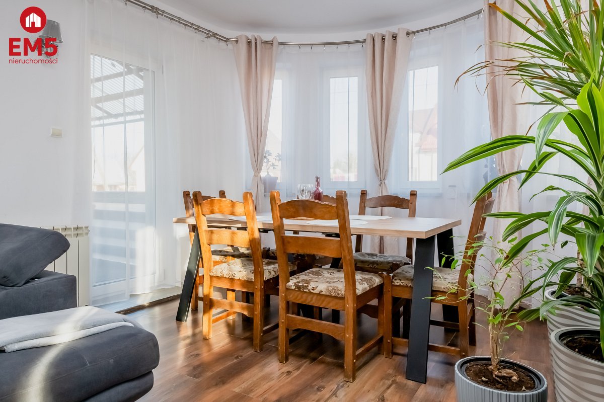 - Pierwsze piętro: trzy pokoje, w tym jeden z wyjściem na duży balkon, oraz łazienka.