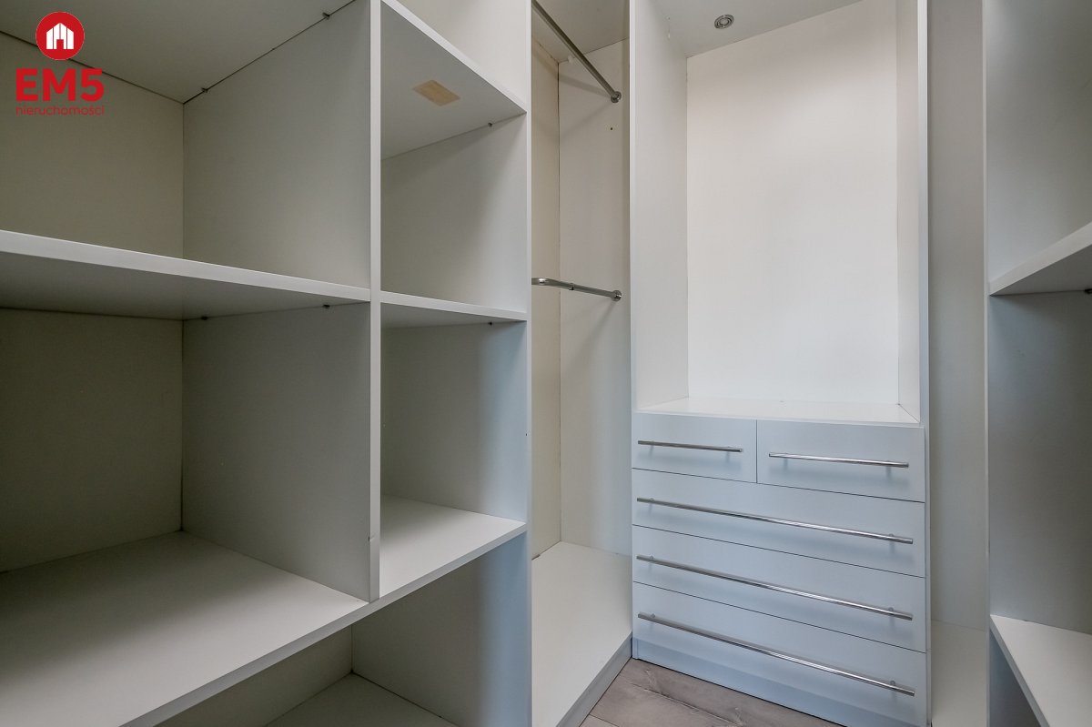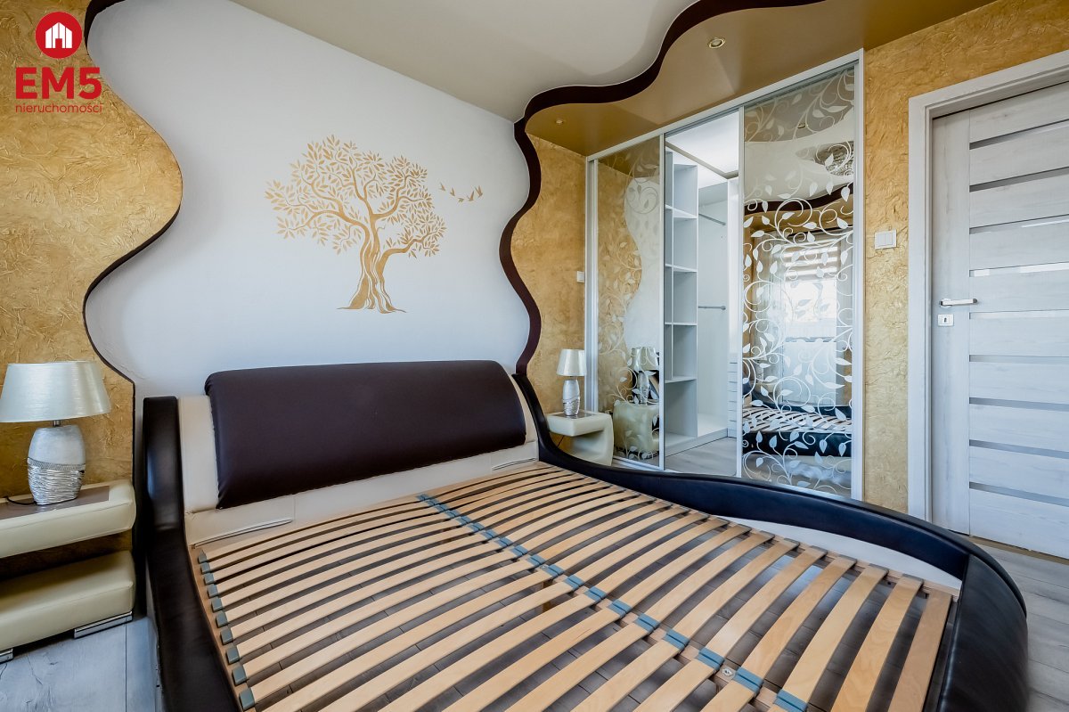 - Sypialni z dużym łóżkiem, przestronną garderobą i wyjściem na balkon.
