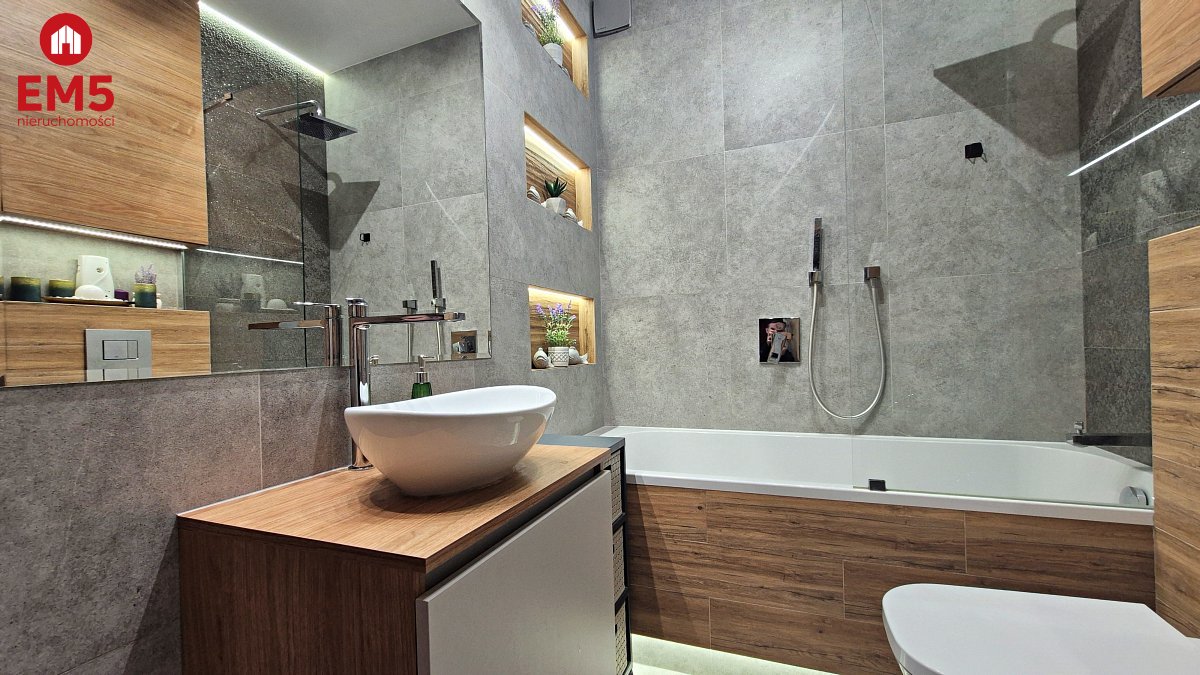 - elegancka łazienka wykończona gustownymi płytkami i oświetleniem LED,