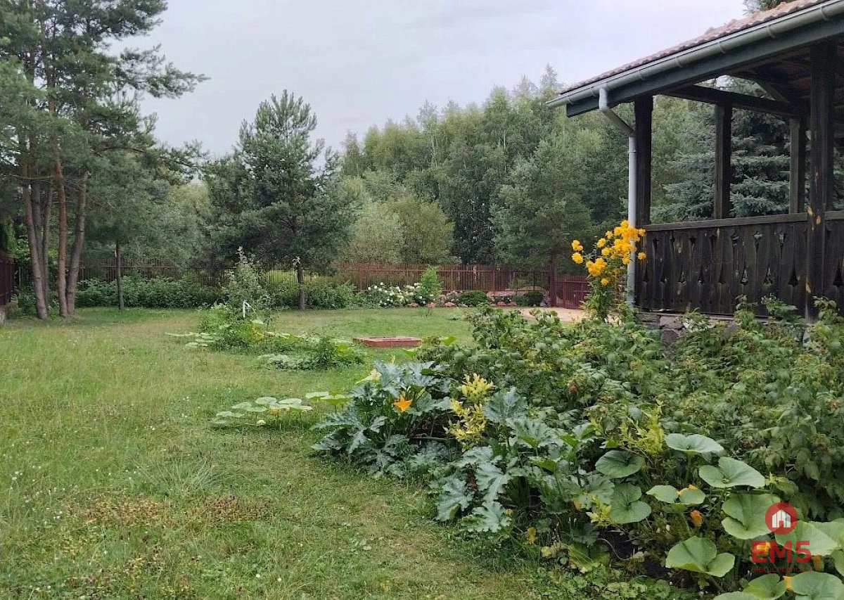 Nasadzenia: sosny, rośliny trwałe zielone ozdobne, krzewy i drzewa owocowe (maliny, winogrona, porzeczki, poziomki), urządzony ogródek warzywny.