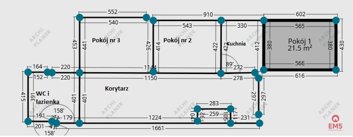 - Układ: 3 niezależne pokoje, osobna kuchnia, łazienka z WC
