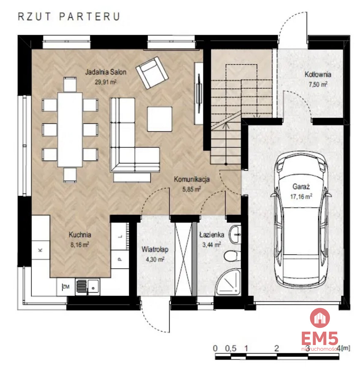 - Na parterze: kuchnia, jadalnia ,salon i łazienka.