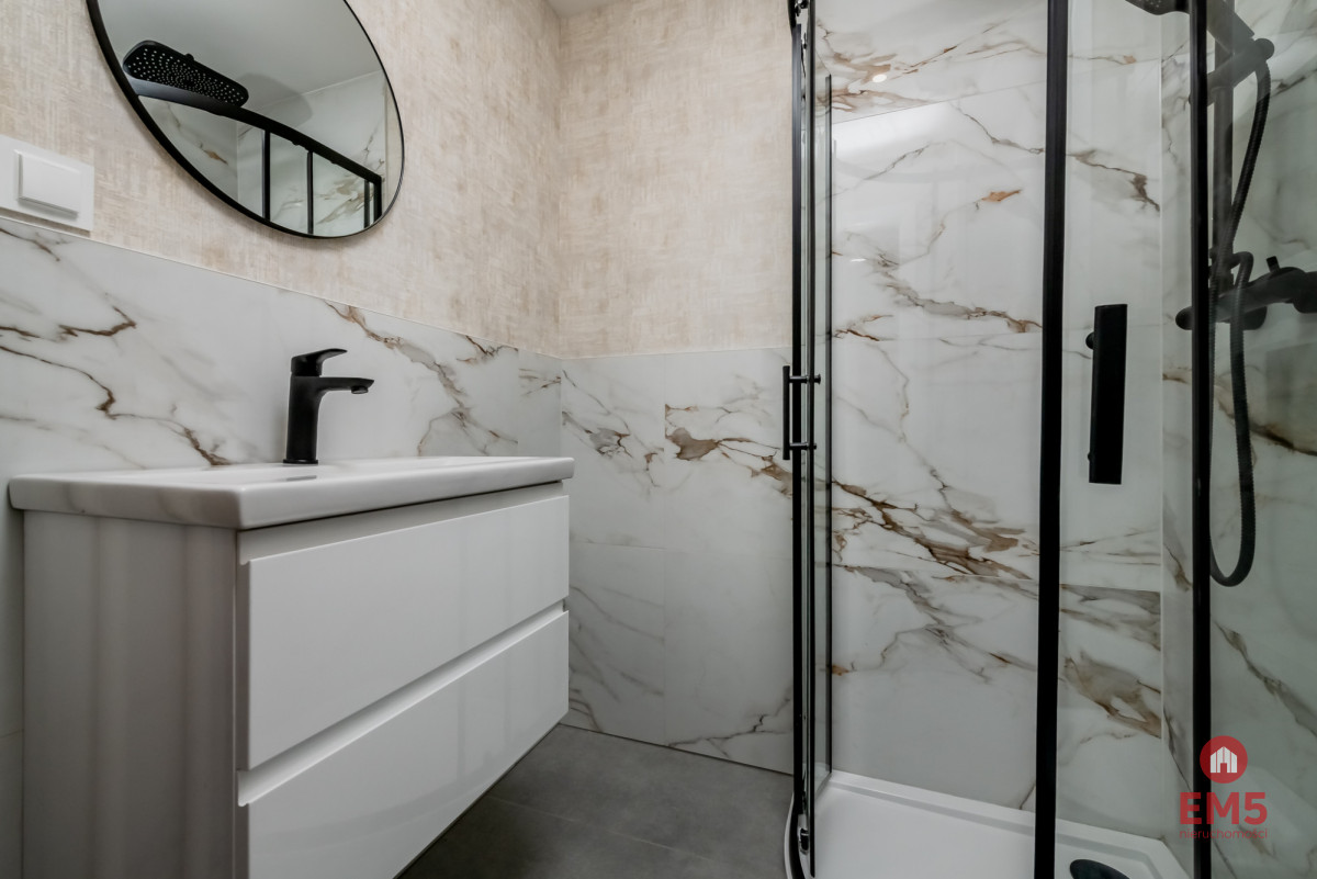 - łazienka z prysznicem połączona z wc z wnęką na pralkę