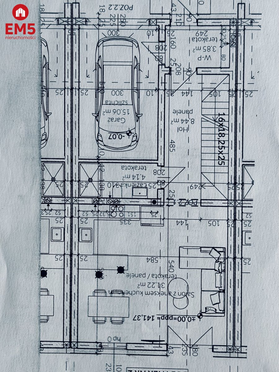 Garaż znajduje się w bryle budynku, jednostanowiskowy, dodatkowo jest miejsce postojowe przed garażem.