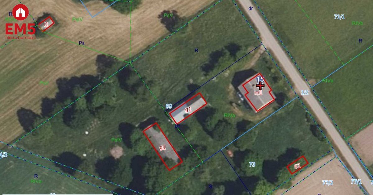 Numery działek: 69 powierzchnia 5979m2 (0,5979 ha) - tu stoi dom mieszkalny 150m2 to jego powierzchnia (jedna kondygnacja) oraz budynki gospodarcze widniejące na zdjęciach. Do domu przynależy działka o nr 73 powierzchnia 2077m2 ( 0,2077 ha), która zawarta jest już w cenie.