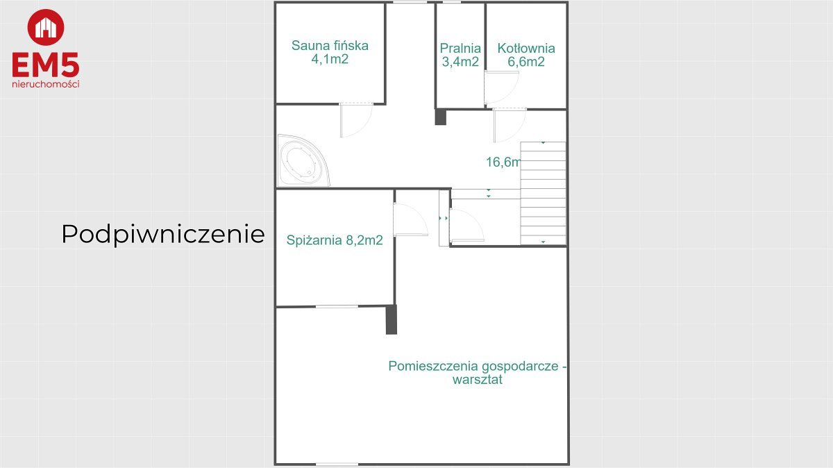 - Piwnica: sauna fińska, przestronna część techniczna z pralką, dużą wanną, palnikiem gazowym, kotłownia, pomieszczenia do majsterkowania, spiżarnia.