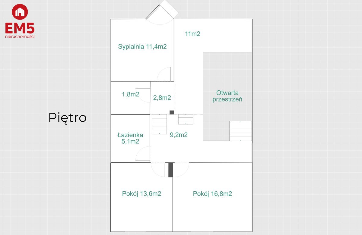- Piętro: hol, trzy sypialnie, łazienka, garderoba, balkon z jednej z sypialni.