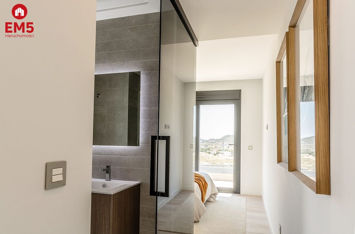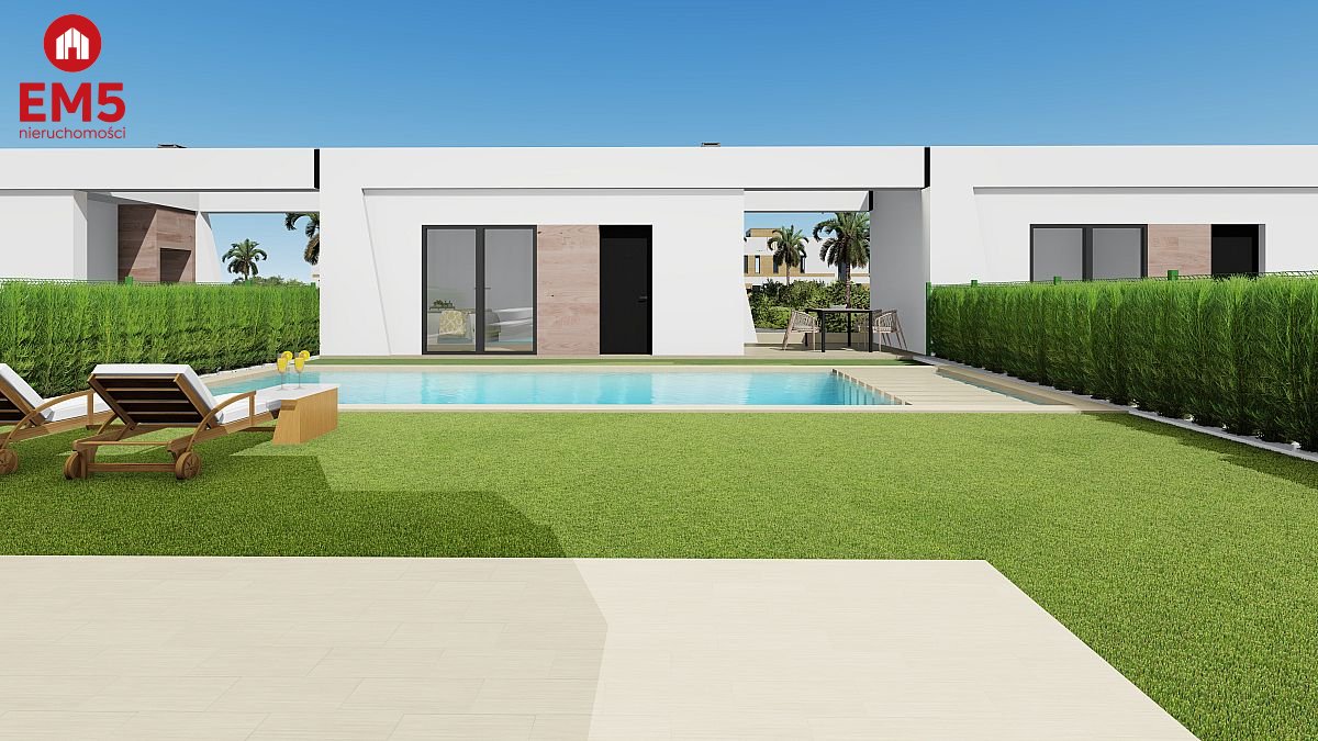 Przytulny taras z wyjściem na główną willę. Zbudowany jest na jednym poziomie. Prywatny parking i teren zielony.Na posesji znajduje się również duży Basen i trawnik. Blisko do lotniska w Alicante, Niedaleko pola golfowe.