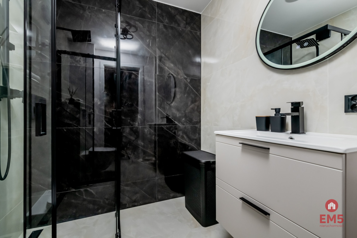 Wnętrza wyróżniają się wysoką jakością wykończenia - dębowa podłoga oraz granitowe parapety nadają elegancji i trwałości. Nowoczesne rozwiązania takie jak dotykowe włączniki światła oraz prysznic z odpływem liniowym zapewniają komfort codziennego użytkowania. Drzwi zlicowane ze ścianą dodają wnętrzom nowoczesnego charakteru.