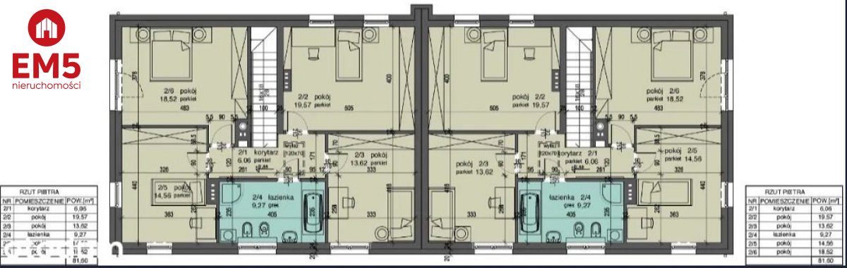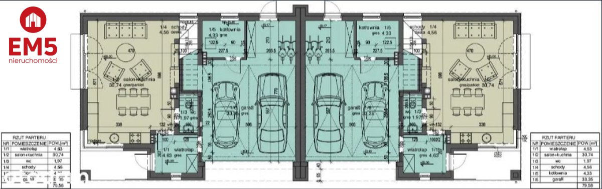 Wnętrze domów jest przestronne i funkcjonalne. Parter o powierzchni 79,58 m2 obejmuje salon z kuchnią (30,74 m2), wiatrołap, WC, kotłownię oraz garaż na dwa auta (33,35 m2). Na piętrze znajduje się 5 pokoi o łącznej powierzchni 81,6 m2, a także łazienka i korytarz. Dodatkowo istnieje możliwość adaptacji poddasza o powierzchni około 70 m2.