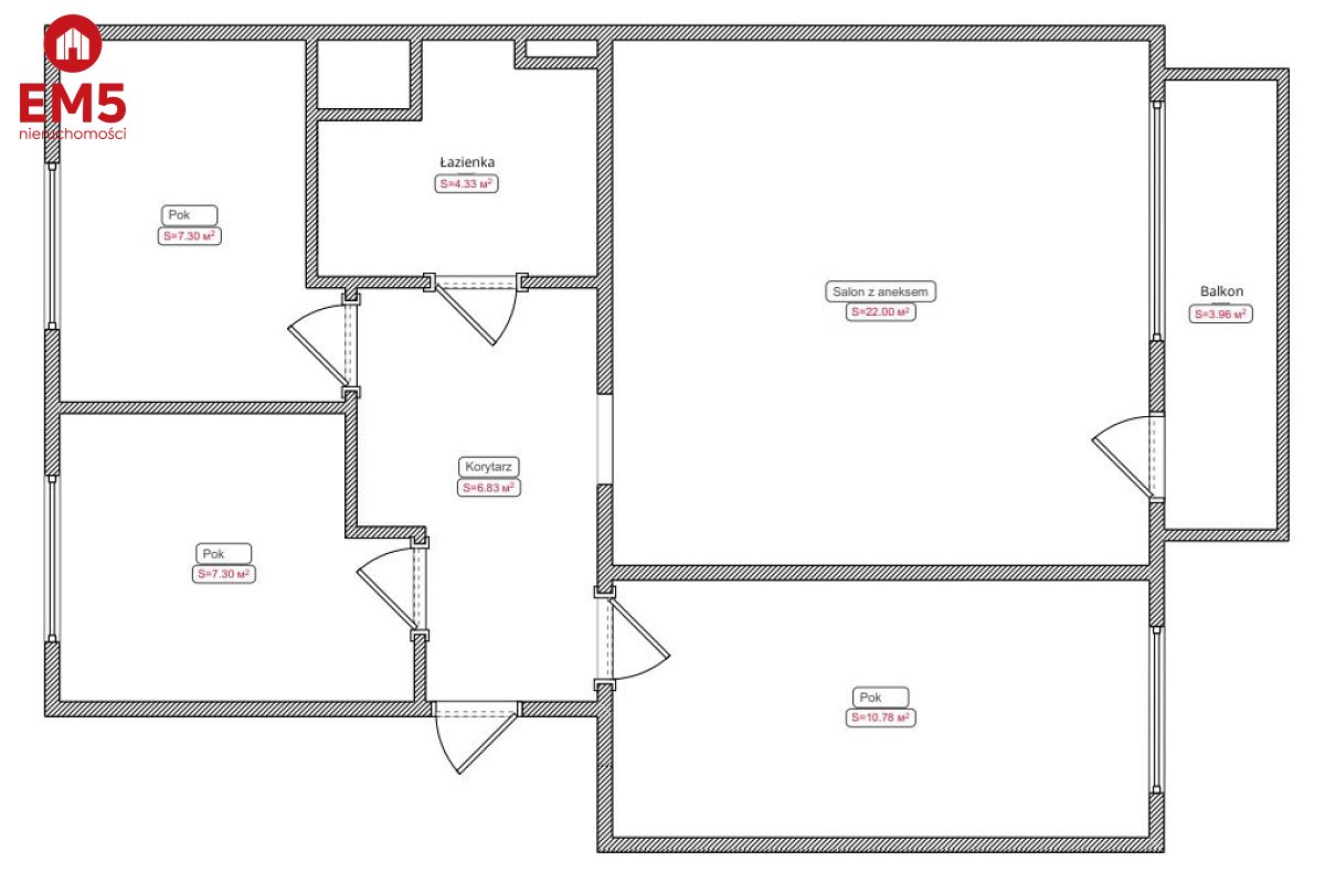 - Powierzchnia 60 m2: salon z aneksem kuchennym oraz 3 oddzielne pokoje.