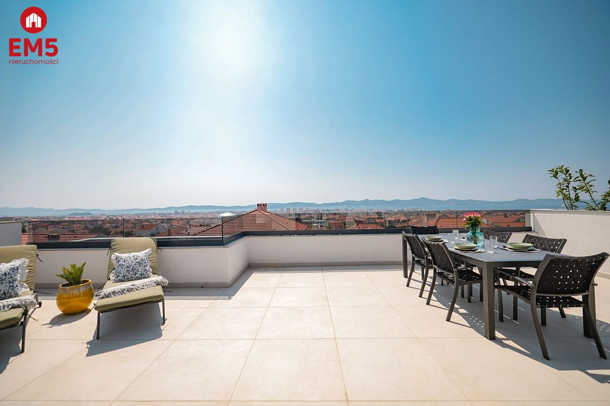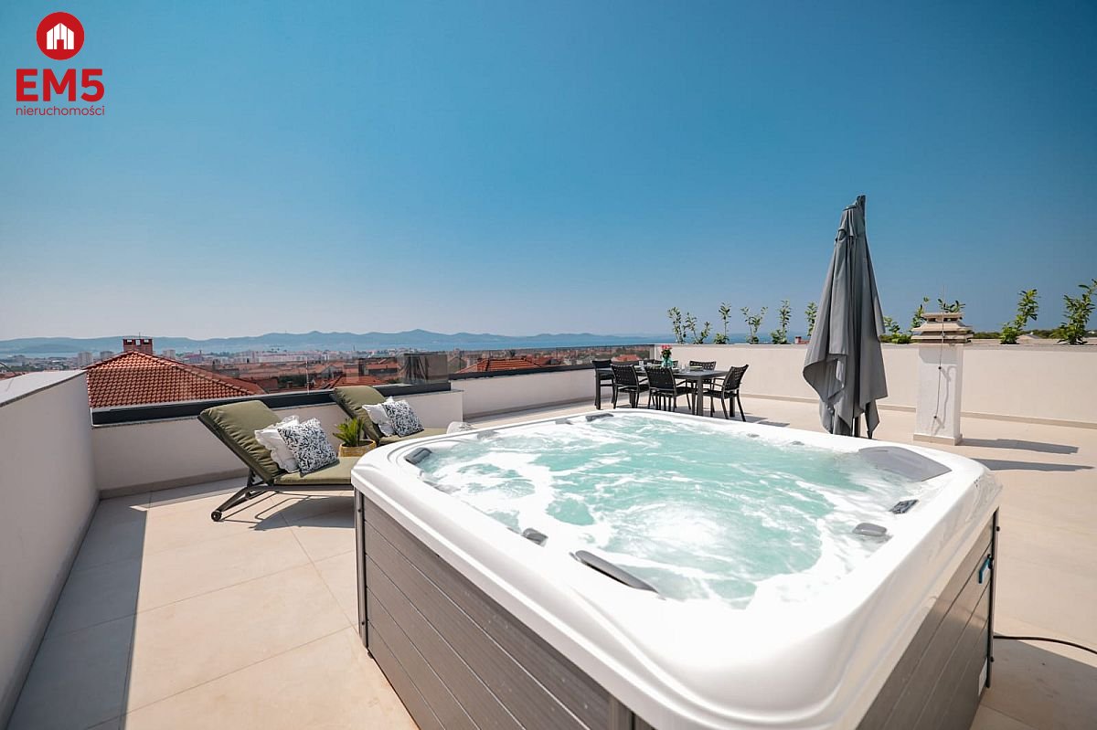 Szczególnym atutem mieszkania jest duży taras na dachu z jacuzzi, z którego właściciele mogą cieszyć się niezakłóconym widokiem na cały Zadar, morze i wyspy.