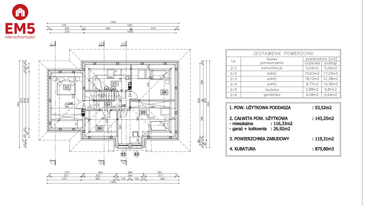 - Piętro: 4 pokoje o różnej wielkości, łazienka.
