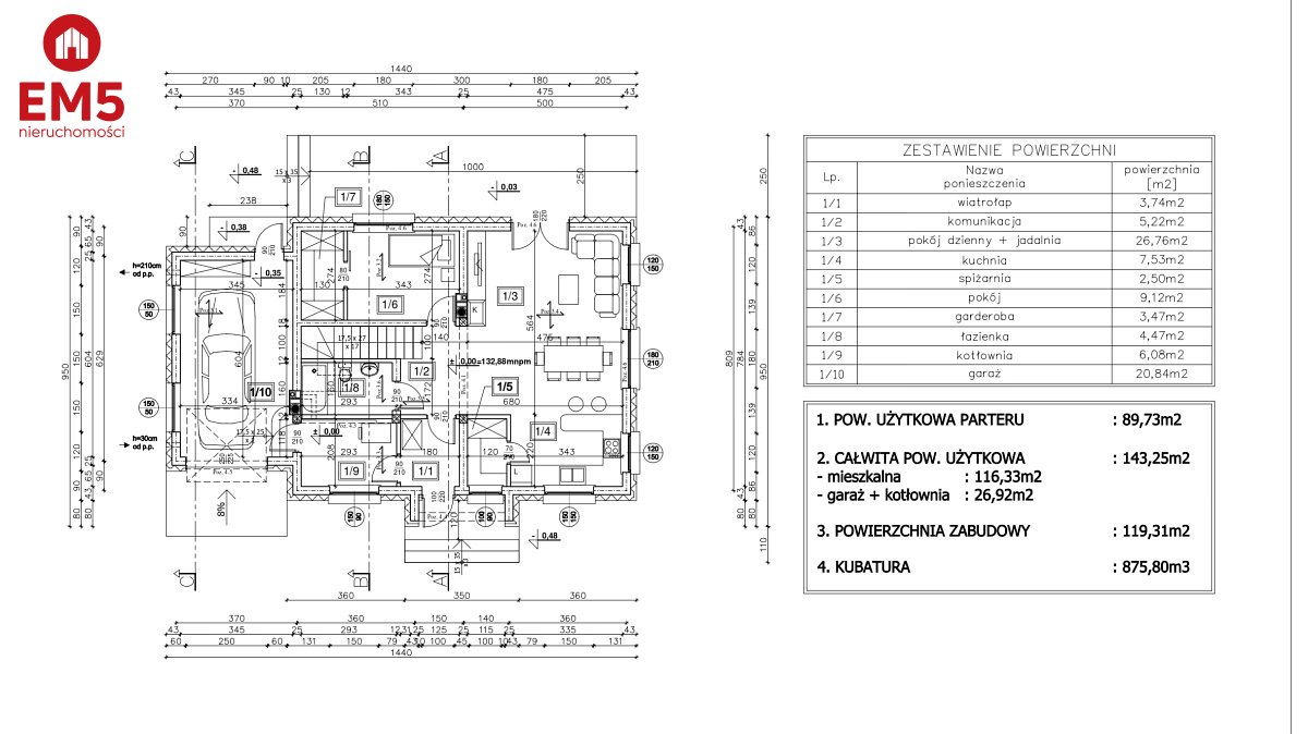 - Parter: garaż, przedsionek, kotłownia, otwarty salon z aneksem kuchennym i wyjściem na duży taras, mała spiżarnia, łazienka.