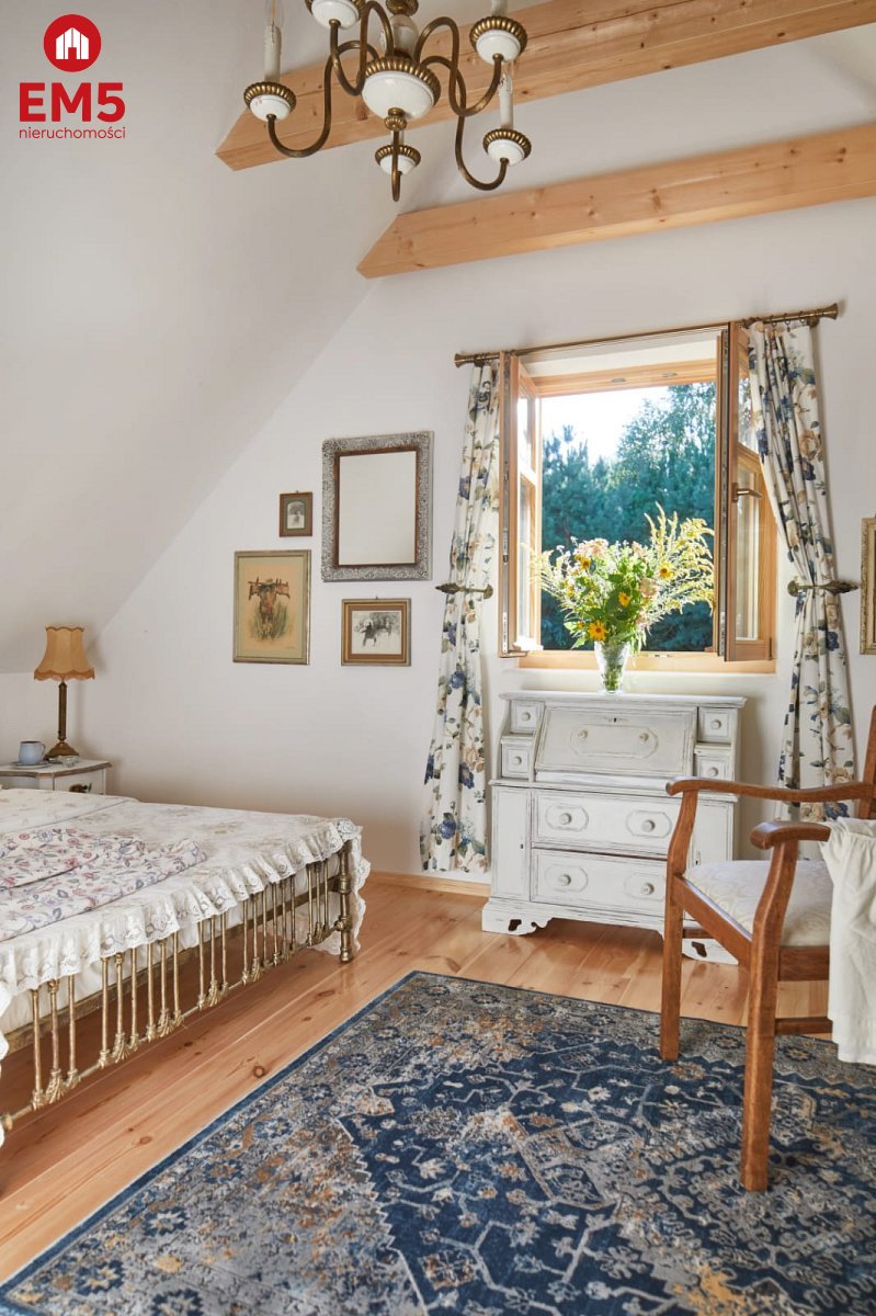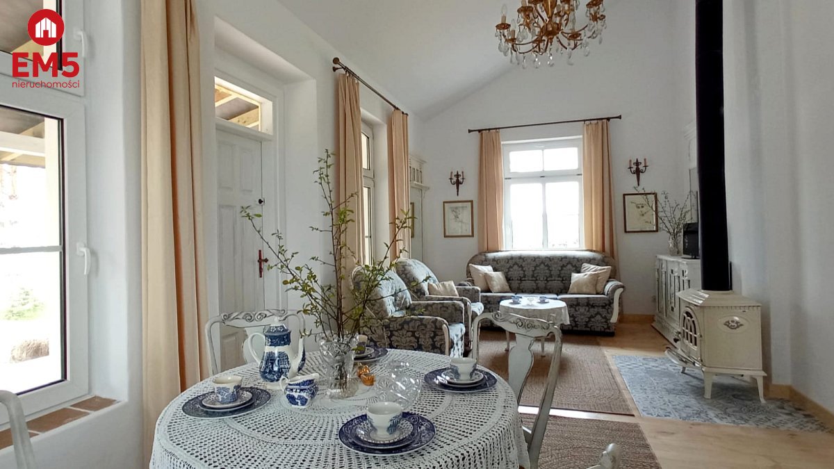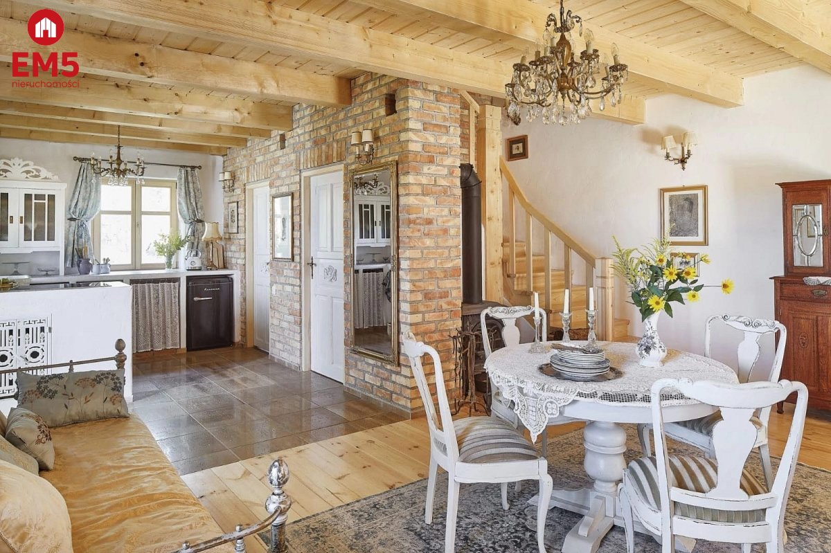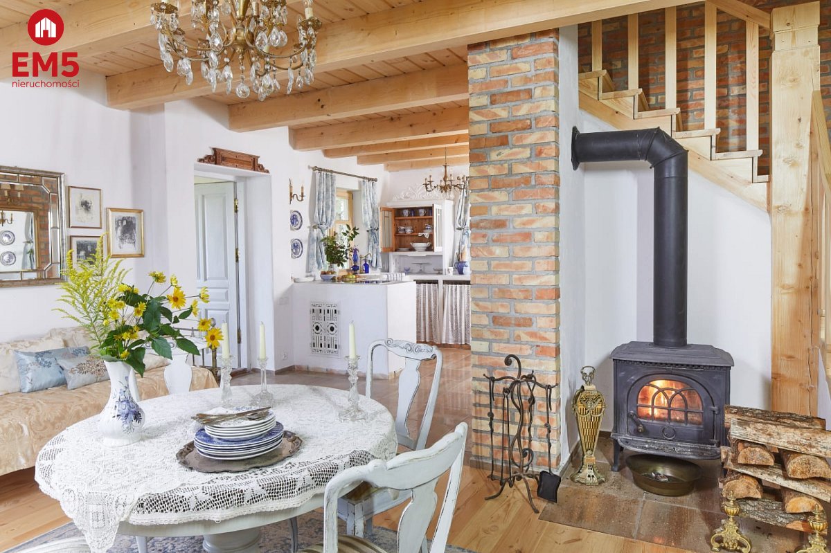 Wchodząc do tego domu masz wrażenie, jakby czas na chwilę się zatrzymał. Już od progu otacza Cię ciepło i wyjątkowy klimat wnętrza - przestronny salon z klimatycznym kominkiem Jotul zaprasza, by usiąść wygodnie i zanurzyć się w atmosferze spokoju. Obok czeka jasna, funkcjonalna kuchnia, na widok której momentalnie wyobrażasz sobie poranne śniadania w domowej atmosferze, a także komfortowa łazienka z prysznicem, zapewniająca wygodę codziennego życia. Gdy wejdziesz po solidnych, drewnianych schodach na piętro, odkryjesz dwie urokliwe sypialnie - idealne miejsca, by zwinąć się w miękkiej pościeli i odpocząć po dniu pełnym wrażeń. Tuż obok znajduje się dodatkowa toaleta, zapewniająca wygodę domownikom i gościom. Na zewnątrz, z salonu, wychodzisz na ozdobny, 20-metrowy taras z rzeźbionymi słupami, gdzie poranne promienie słońca i śpiew ptaków tworzą niepowtarzalną aurę. A kiedy zejdziesz do piwnicy, odkryjesz cztery osobne pomieszczenia - przestrzeń, którą możesz wykorzystać według własnych potrzeb: od pracowni, przez siłownię, po dodatkowe zaplecze gospodarcze. Ten dom to prawdziwa architektoniczna perełka - doceniona przez prestiżowy magazyn Weranda Country, który poświęcił jej aż 16 stron wraz z profesjonalną sesją zdjęciową!